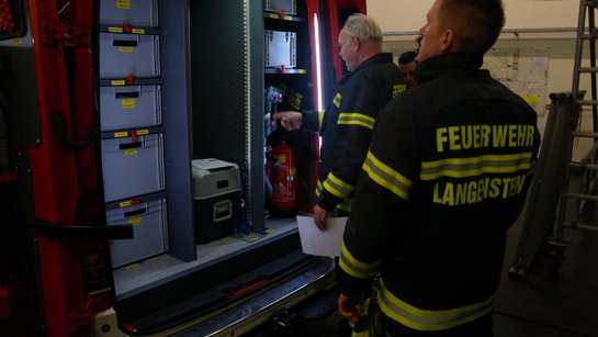 Simon Pilgersdorfer führte die Teilnehmer in kleinen Gruppen durch die verschiedenen Funktionen des neuen Fahrzeugs. Dabei wurden Blaulicht, Beleuchtung, EDV-Station und die Beladung getestet, und viele Fragen geklärt. Die Mannschaft zeigte sich beeindruckt von der durchdachten Ausstattung und den vielfältigen Einsatzmöglichkeiten. Währenddessen wurde auch der restliche Fuhrpark einer gründlichen Inspektion und Reinigung unterzogen.